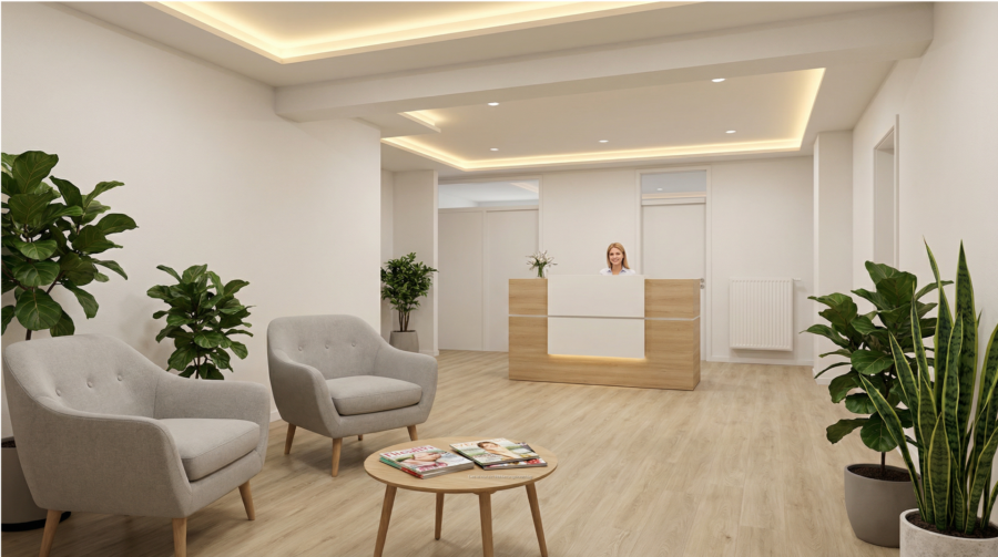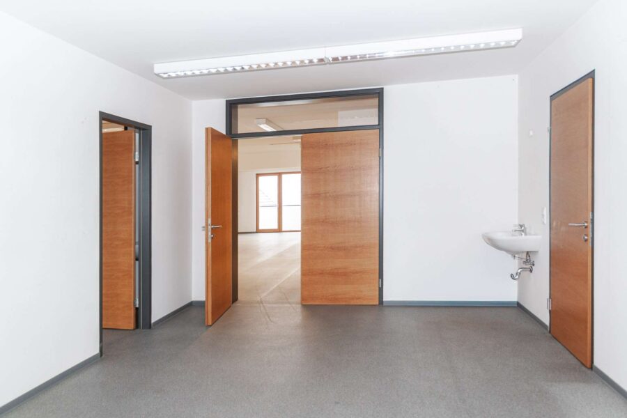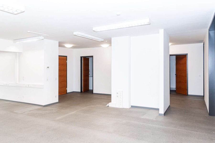 großer Eingangsbereich mit Garderobe, lichtdurchfluteter offener Großraum der bei Bedarf auch abgetrennt werden kann, somit würde ein viertes südseitiges Büro/Besprechungszimmer entstehen. 3 weiter straßenseitige Büros oder Ordinationsräume die extern begehbar als auch intern erschlossen sind. Jedes Zimmer verfügt über ein eigenes Handwaschbecken.
