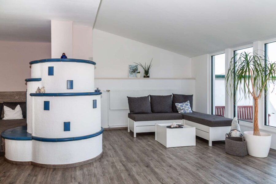 Ein weiteres Highlight ist der große, lichtdurchflutete Wohnbereich, der ebenfalls vom Vorraum aus zugänglich ist. Hier erwartet Sie eine moderne, offene Küche mit hochwertiger Ausstattung und integrierter Speis. Der Essbereich mit gemütlichem Kachelofen bildet das Herzstück dieses Wohnraums. Der anschließende Wintergartenbereich mit Couch bietet direkten Zugang zur Terrasse sowie in den Garten.